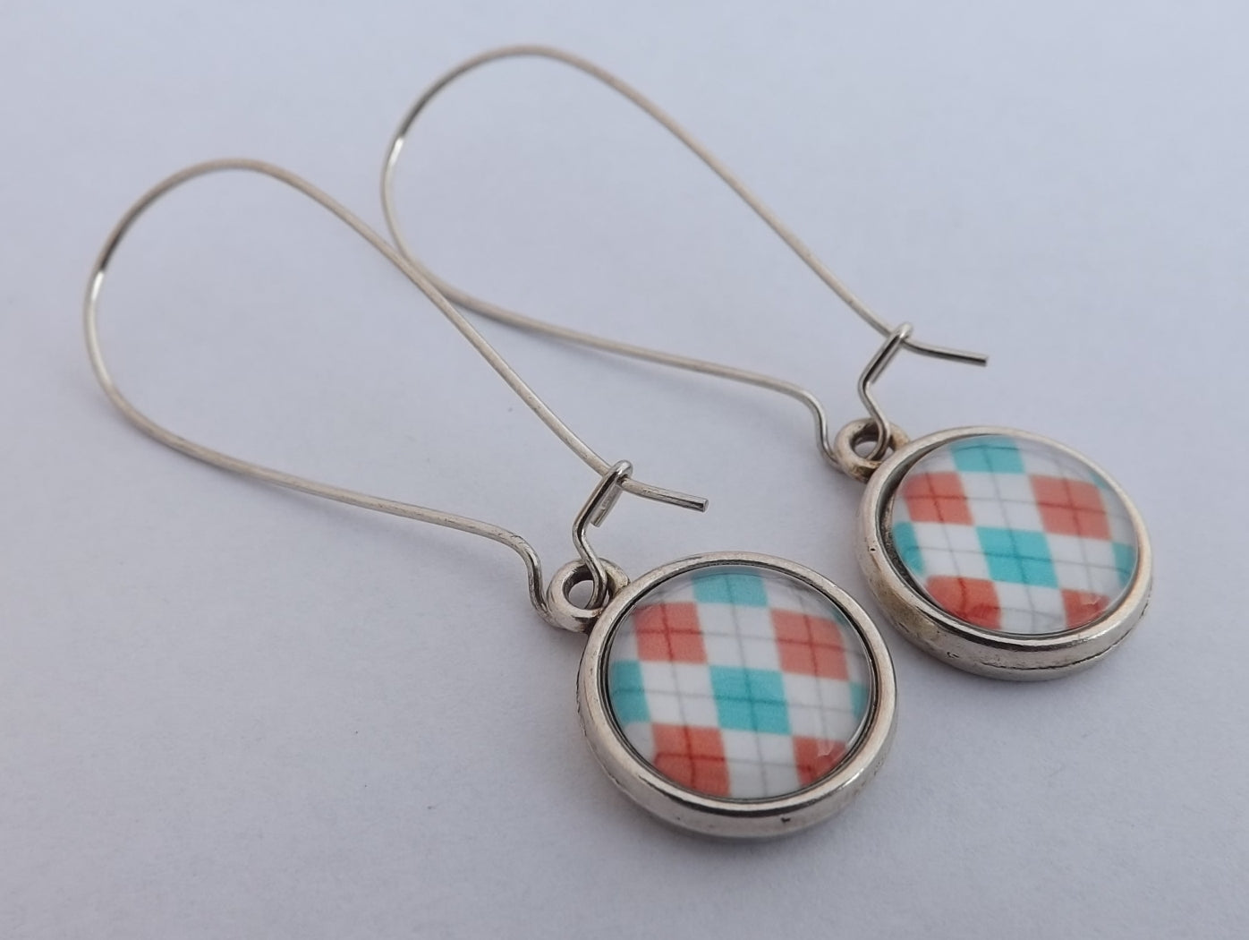 Blue, Pink & White Checkered  Dome Earrings on Long Kidney Hooks