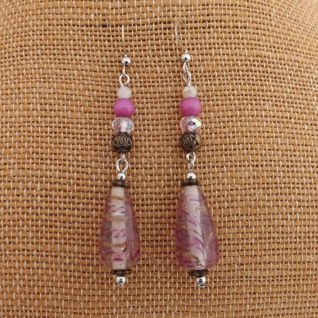 Pink, Bronze & Silver Handmade Glass Lamp Work Bead Drop Earrings