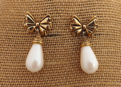 Vintage Gold Tone Bow & Faux Pearl Drop Earrings