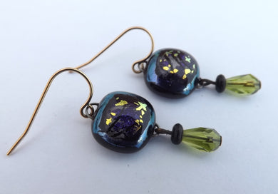 Blue, Gold, Black & Green Dichroic Glass Drop Earrings