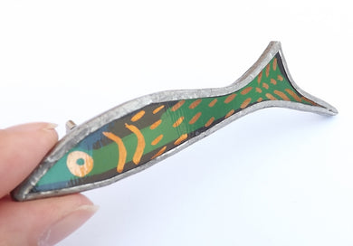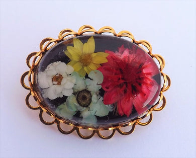 Red, White & Yellow Dried Flowers in Acrylic Resin, Gold Tone Brooch