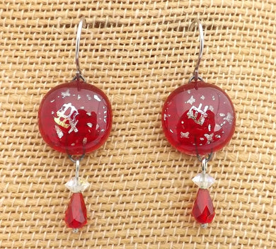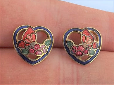 Pink Flower & Butterfly in Blue Heart, Vintage Enamel Stud Earrings