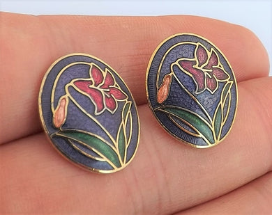 Pink Flower on Purple, Oval Vintage Enamel Stud Earrings